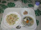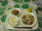 10月13日の給食『秋の香りごはん・いわしのつみれ汁・なし・牛乳』