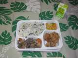 本日のメニュー『ごはん・ふりかけ(かつお)・豚肉と大根のうま煮・おひたし(青菜)・牛乳』