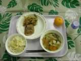 本日のメニュー『ごはん・鶏肉のレモンソースかけ・和風サラダ・野菜スープ』