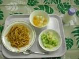 本日のメニュー『五目焼きそば・野菜の中華漬け・おからマフィン・牛乳』