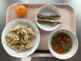 ◆◇今日の献立◇◆ 秋の香りごはん ししゃものカレー揚げ 根菜汁 みかん 牛乳...