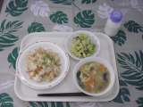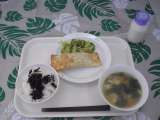 12月6日(木)メニューは、ごはん、ひじきふりかけ、棒ぎょうざ、中華サラダ、わかめと鶏のスープ、牛乳です。
