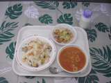 12月14日(金)メニューは、えびピラフ、ミネストローネ、シーザーサラダ、牛乳です。