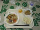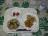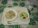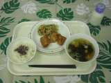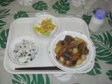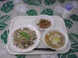 本日の給食『中華おこわ・わかめスープ・大学いも・牛乳』
