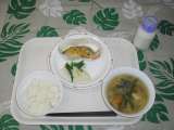 本日のメニュー『ごはん・鮭の味噌マヨネーズ焼き・野菜のゆず漬け・豆腐の味噌汁・牛乳」』