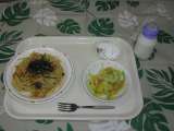 本日のメニュー『和風スパゲッティ・コーンサラダ・チョコレートケーキ・牛乳』