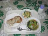 本日のメニュー『あげパン(しろごま)・白菜と肉団子のスープ・マセドアンサラダ・牛乳』