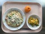 ◆◇今日の献立◇◆ 鮭のクリームスパゲッティ キャロットソースサラダ ポンカン...