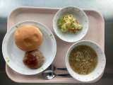 ◆◇今日の献立◇◆ 丸パン ハンバーグ キャベツサラダ ABCスープ 牛乳