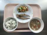◆◇今日の献立◇◆ わかめごはん ししゃもの南蛮漬け おひたし 豚汁 牛乳