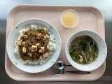 ◆◇今日の献立◇◆ マーボー豆腐丼 もやしスープ りんごゼリー 牛乳