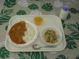 本日の給食『ハッシュドポークライス・こんやくサラダ・みかんゼリー・牛乳』