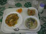 本日の給食『キムチ丼・ワンタンスープ・ナムル・せとか・牛乳』
