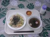 3月4日(月)メニューは、ごはん、ふりかけ、鶏肉のレモンソースかけ、わかめサラダ、なめこのみそ汁、牛乳です。