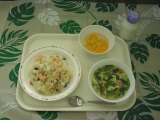 3月12日(火)メニューは、ソース焼きそば、わかめスープ、白菜の中華サラダ、フルーツ白玉、牛乳です。