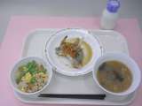 メニュー:さくらの花のごはん・魚の西京焼き・和風サラダ・よしの汁・牛乳
