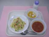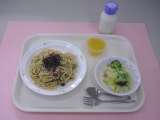 メニュー:和風スパゲッティ・ゆで野菜のドレッシングがけ・みかんゼリー・牛乳