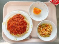 (献立)・スパゲッティミートソース・ハニーサラダ・清美オレンジ・牛乳ハニーサラダ...