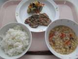◆◇今日の献立◇◆ ごはん 豚肉のみそソースがけ おひたし きのこの卵とじ汁 牛...