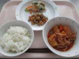 ◆◇今日の献立◇◆ ごはん トマト肉じゃが 大豆とじゃこの甘辛揚げ 塩和え 牛乳...