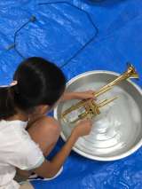 金管バンドクラブ 楽器のお手入れをしています。 日頃、自分が使っている楽器を、て...