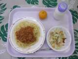 今日の給食『スパゲティー(ミートソース)・シーザースサラダ・冷凍みかん・牛乳』
