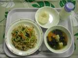 今日の給食『ビビンバ・わかめと鶏肉のスープ・牛乳・梨』