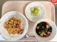 (献立)チーズ入りチキンライスフレンチサラダ洋風卵スープ牛乳チーズ入りチキンライスは、ケチャップやカレー粉などで味付けしたチキンライスにコロコロチーズを混ぜて仕上げました。ごはん全体に広がったチーズの...