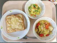 (献立)ツナチーズトーストポトフコーンサラダ牛乳ツナチーズトーストは、玉ねぎとツナ、マヨネーズを合わせて塩胡椒で味付けした具を食パンに塗り、チーズをかけて焼き上げました。