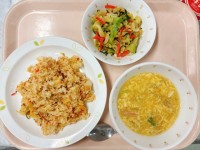 (献立)豚キムチチャーハンチョレギサラダ中華風コーンスープ牛乳豚キムチチャーハンは、豚肉とにんじんなどの野菜を炒め、キムチを加えてごはんと合わせています。辛さも控えめにし、子供達にも食べやすい味に仕上...