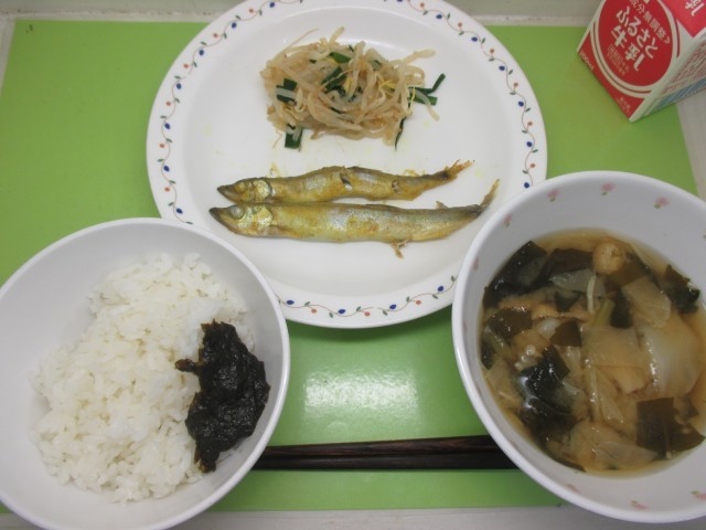 有機米ごはん(青森県産つがるロマン)・牛乳・のりの佃煮・ししゃものカレー焼き・もやしのごま風味・みそ汁