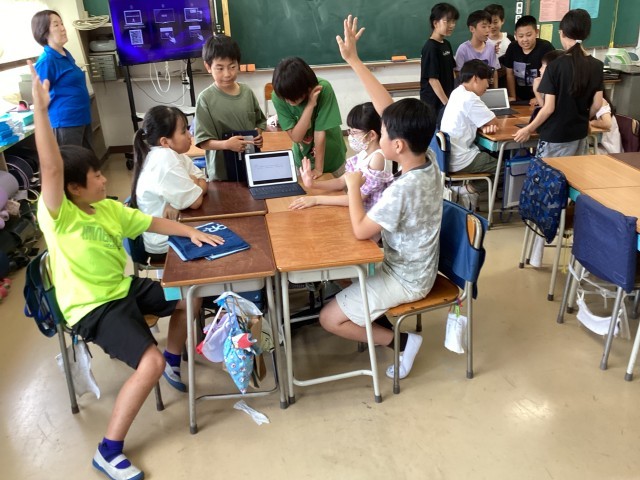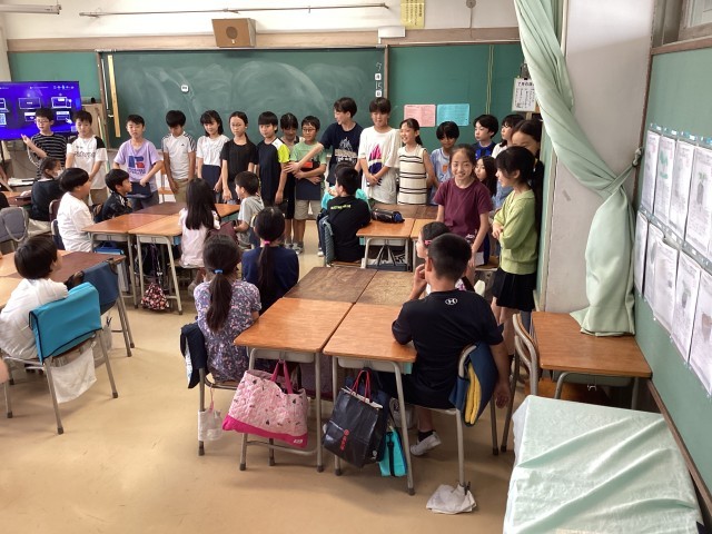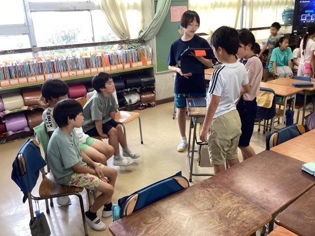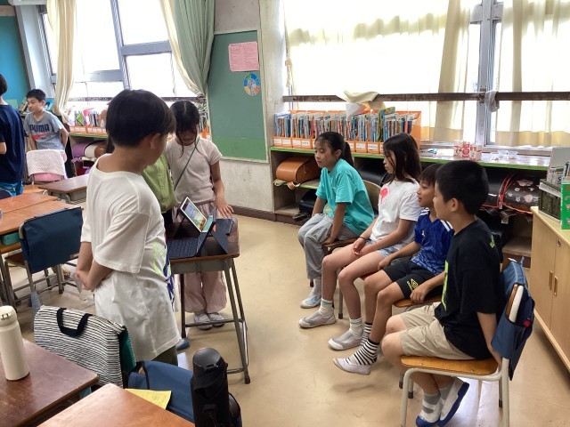 5年生が総合的な学習の時間で取り組んできた、多摩川についての学習を4年生に向けて発表しました。最後に、発表をしてもらった4年生が「多摩川を大切にするために、ペットボトルなどの使用をひかえようと思う。」と発言する姿が見られました。