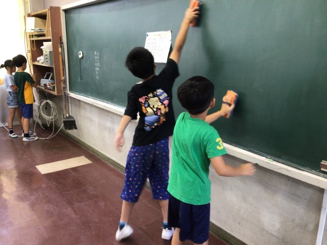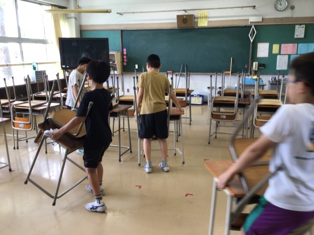 72日間お世話になった教室や下駄箱をみんなできれいにしました。算数ルームは、同じ並びの教室の6年生が自主的に机運びを手伝ってくれました。