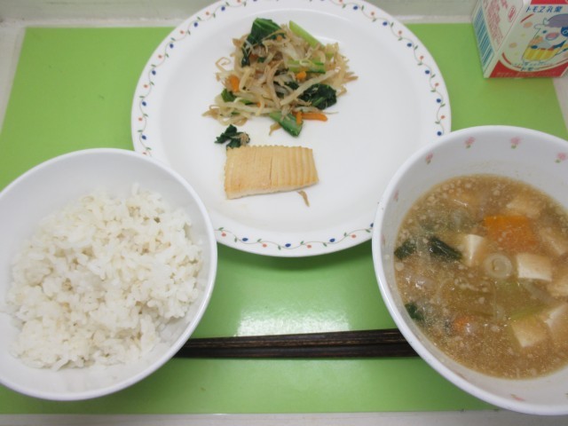 麦ごはん・牛乳・いかの照り焼き・しらすと小松菜の和えもの・マーボー汁