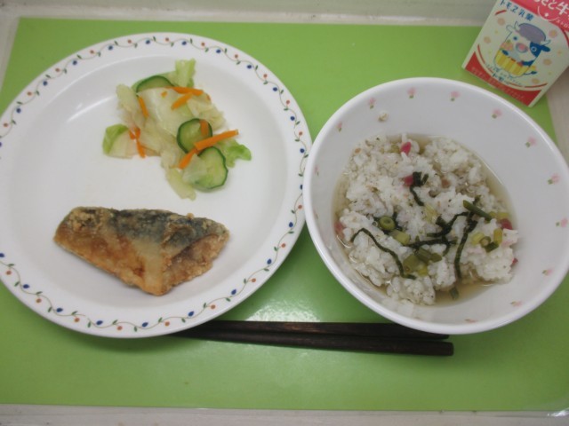 梅茶漬け・牛乳・さばの竜田揚げ・即席漬け