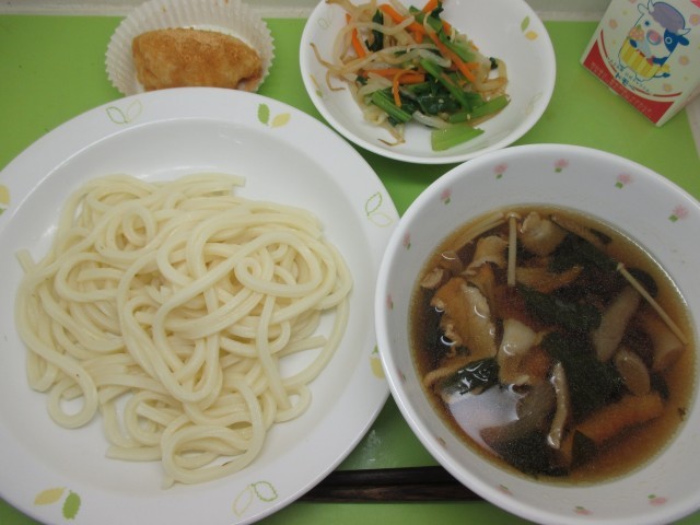 きのこうどん・牛乳・もやしと小松菜のあえもの・きなこおはぎ