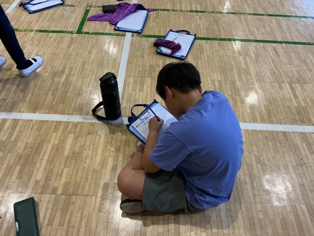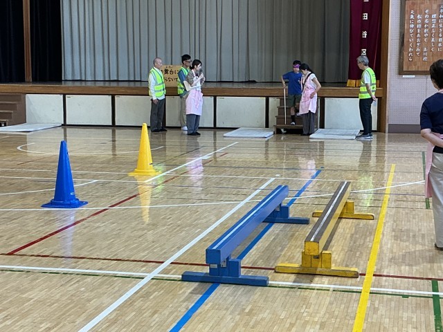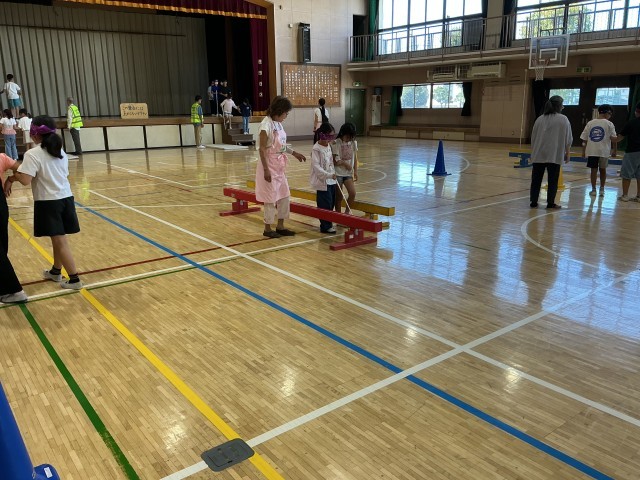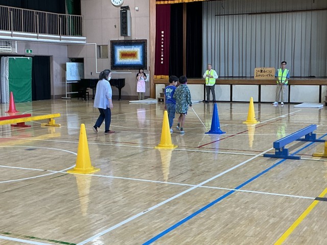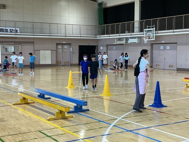 先週、目の不自由な方からたくさんのお話を伺いましたが、今回は目隠しをして実際に白状を使って歩いてみました。案内をする人は、つい「あっち」や「こっち」と言ってしまいがちですが「次は左に曲がります。」など具体的な声がけが大切ということも学びました。コーンの間をジグザクに進む / 階段の上り下り / 平均台の間を歩く の中で一番怖かったのは、"階段の下り" という声が子どもたちの間から聞こえてきました。町のどこかで目の不自由な方が困っているのを見かけたら、適切な声がけができるようになるといいですね。