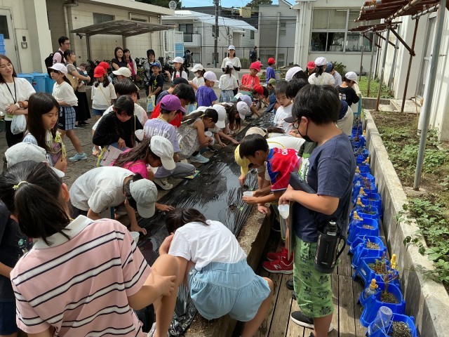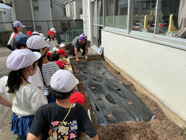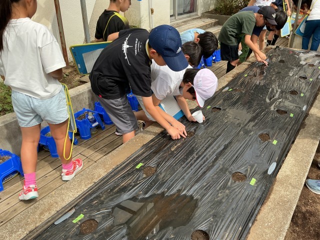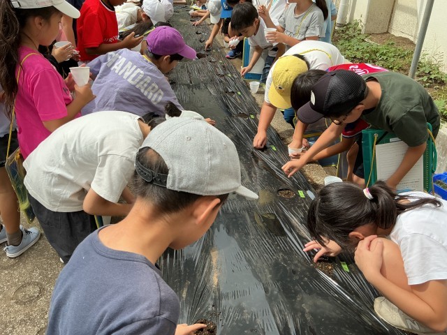 先日、畑を整えて下さった地域の方に今日は大蔵大根の特長や種のまき方を教えていただきました。農薬は一切使用せず、虫除けネットも使用せずに育てます。おいしいものを求めてやってくるシンクイムシ(通称名)に食べられないようみんなで目を光らせます。大きくておいしい大蔵大根に育ちますように!