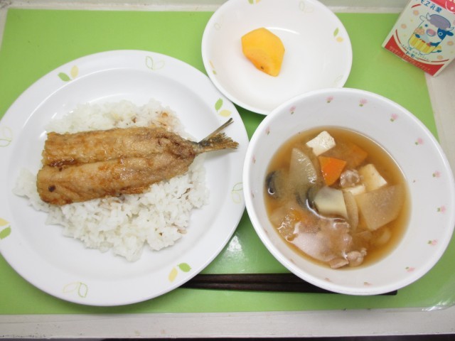 いわしのかば焼き丼・牛乳・豚汁・くだもの(柿)