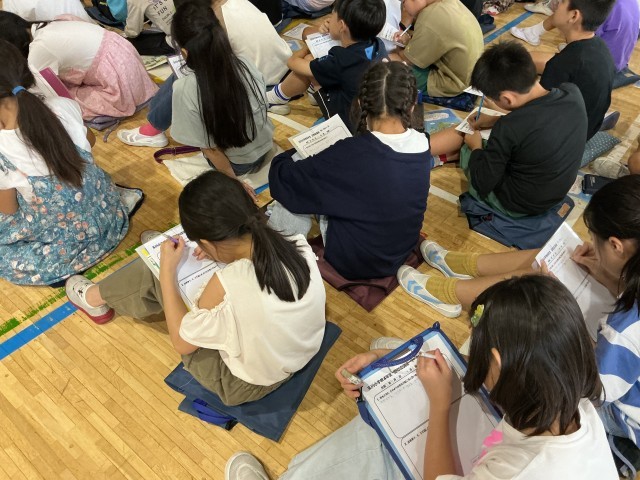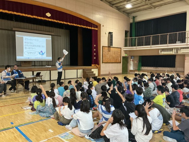 「年を取るとどのような変化が起こりますか?」ワークシートに思い浮かぶ変化を書き込むことから始まりました。外見の変化に加えて目や耳の機能低下、そして脳細胞も変化し、日常生活に支障をきたすこともあります。それらをしっかりと理解することでみんなが心地よく過ごせる社会を作ることができたらいいですね。
