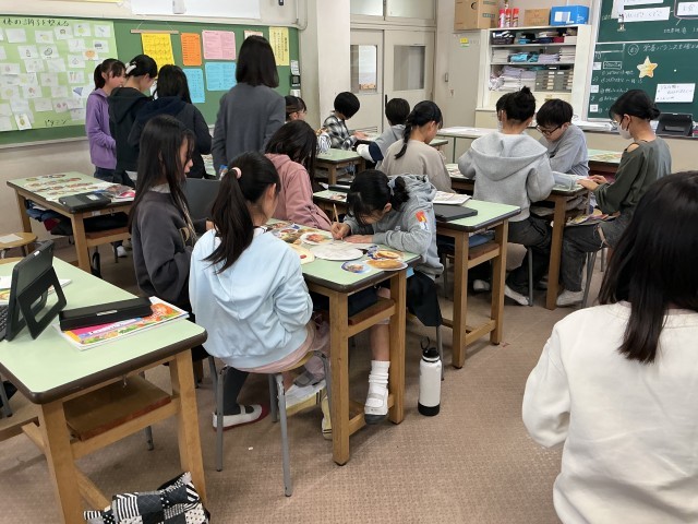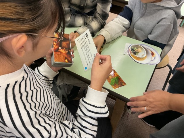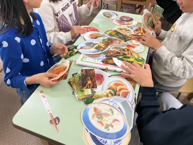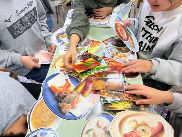 先日の栄養士の先生のお話を踏まえて実際に献立を考えてみました。主菜、副菜。汁物・・食品カードを見ながらグループごとに考えます。