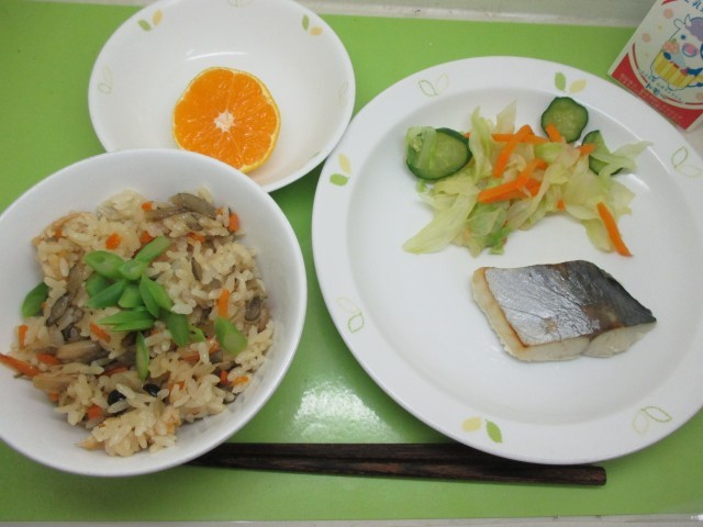 秋のかおりごはん・牛乳・さごしの塩こうじ焼き・即席漬け・菊花みかん