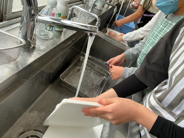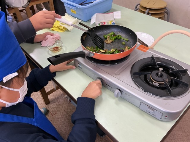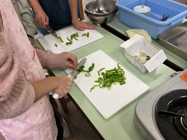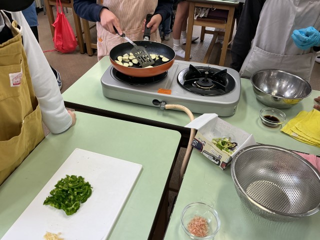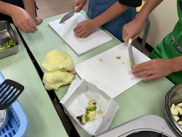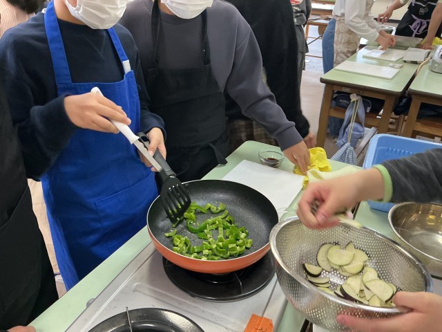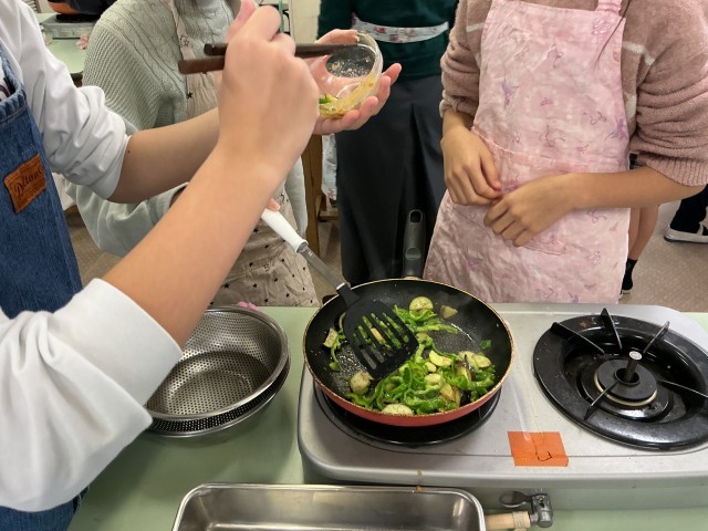 調理実習を行いました。「環境に配慮しておいしい副菜を作ろう」を達成するために、ゴミは不要な紙でゴミ袋を作り、野菜のヘタや種を捨てます。計量した調味料は、器に残った液体を野菜で拭き取り最後の一滴まで使い切ります。野菜はきれいに切り揃え火加減を見ながら上手に作ることができました。
