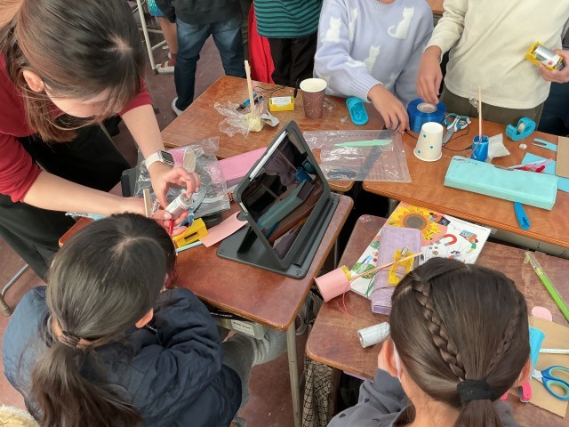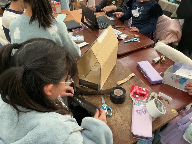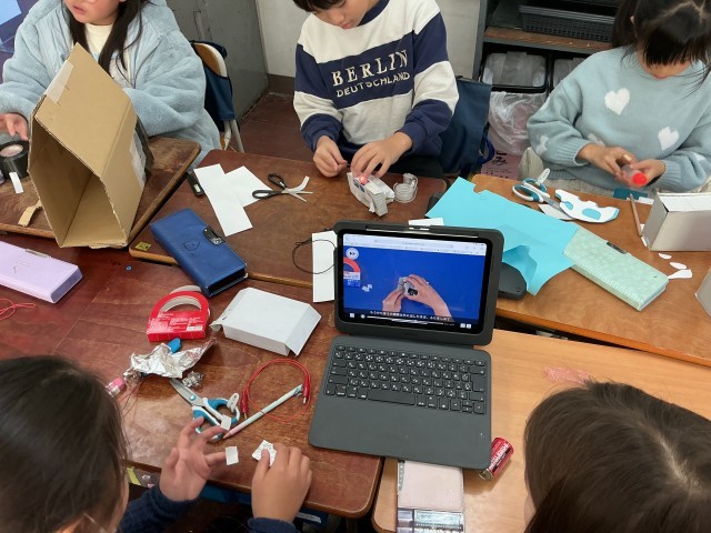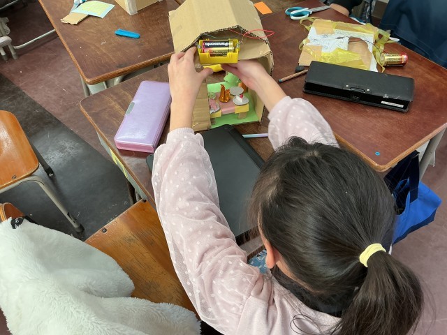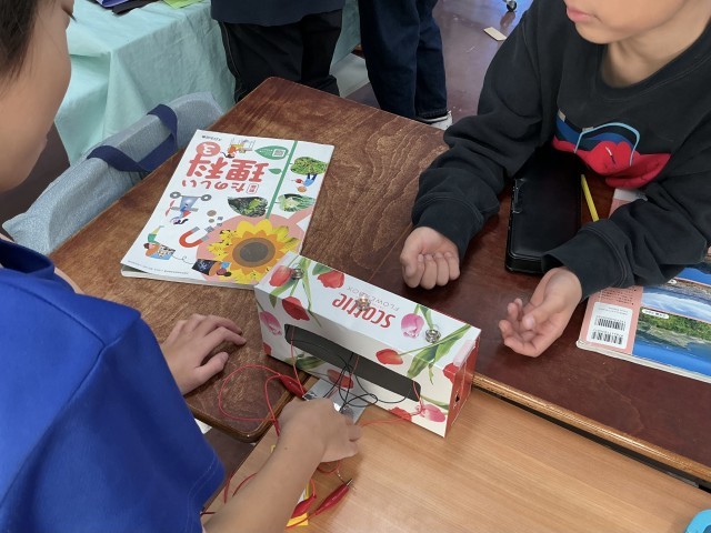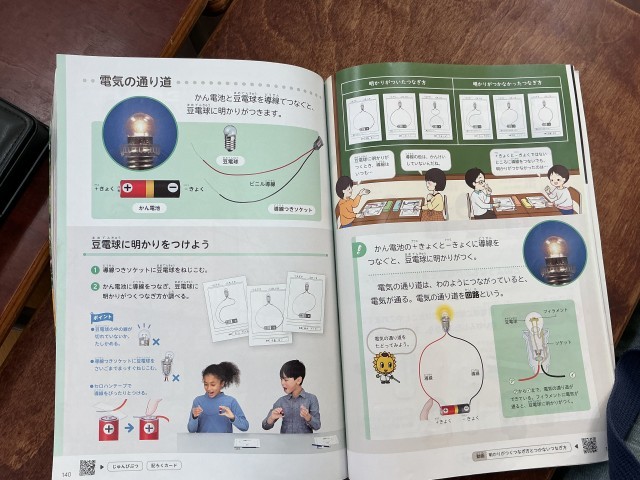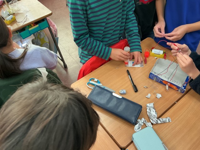 「電気の通り道」学習をしました。乾電池に豆電球の導線をつなぐ際にはプラスとマイナスを間違えないように気をつけ、明かりが灯らなかったり光が弱い時などは、まずは自分で原因を探り手直しをしていました。