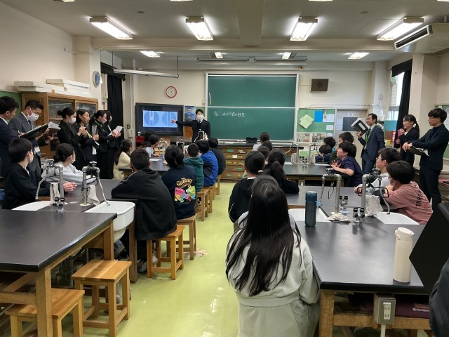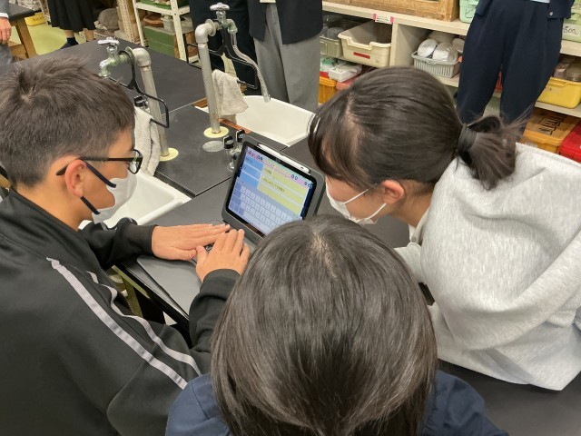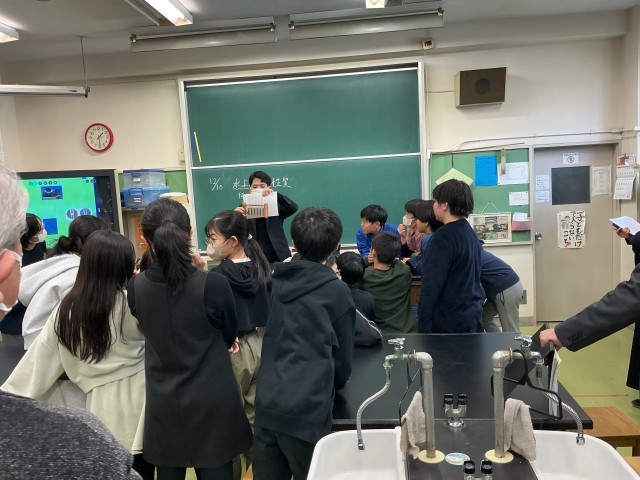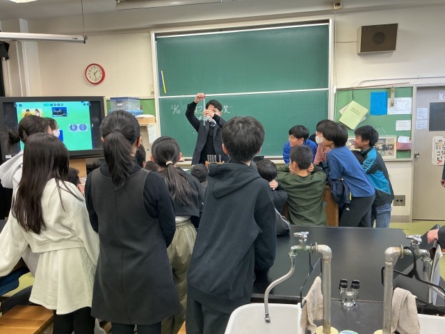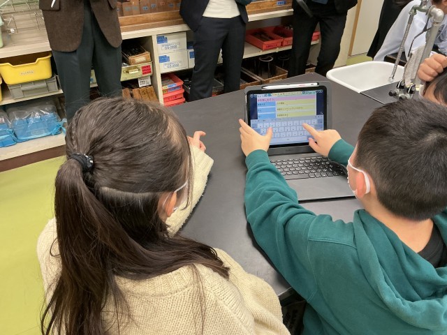 水溶液の学習をしました。数種類の液体の中から水を探します。中には危険な液体も含まれているので「口に含まず」「触らず」を厳守しなければなりません。まずは、班に分かれ見分ける方法を考えました。大勢の大人が囲む中でも子どもたちは普段通りの和やかさを持って授業に臨むことができました。