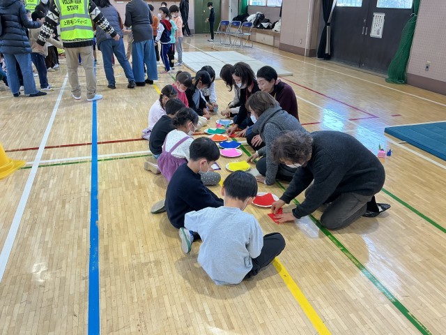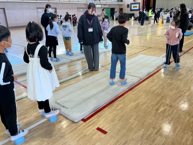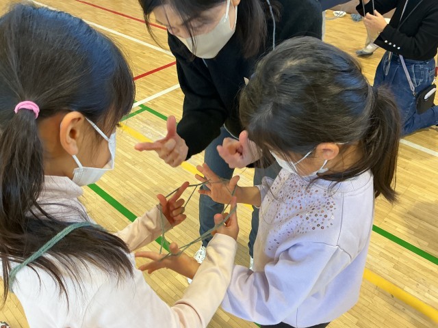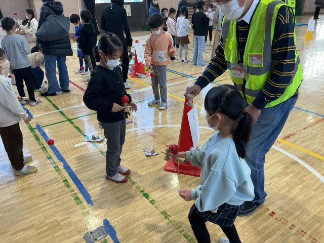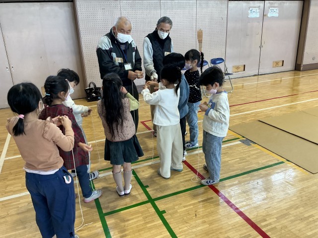 毛糸一本あれば楽しめる"騙し箒"や永遠に続く2人あやとりなどを教えていただきました。ポックリは手と足を連動させないと前には進めず見ているよりも難しい・・・。紙鉄砲は紙質が変わると音も変わるのかな?独楽は糸を巻くところから教えていただきました。古くて新しい遊びに子どもたちの目は輝きっぱなしでした。