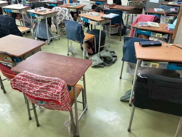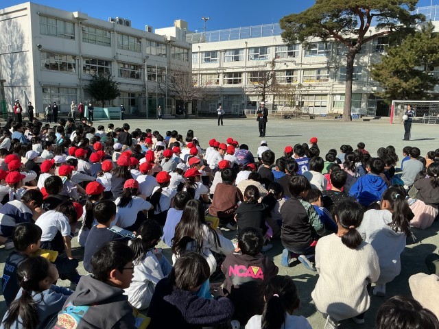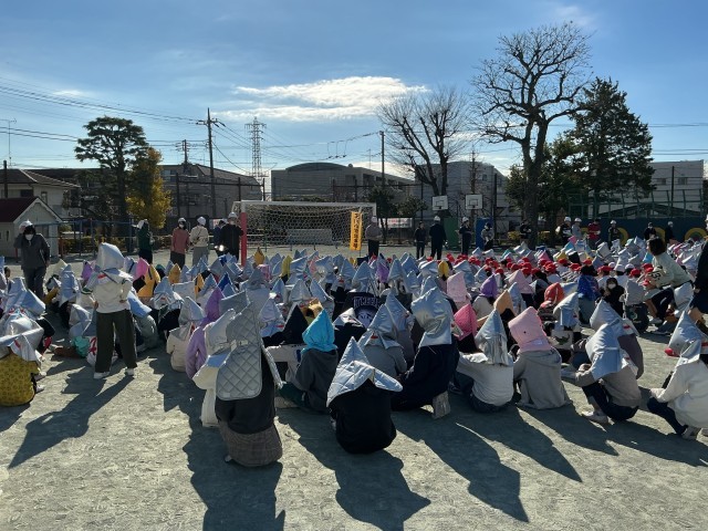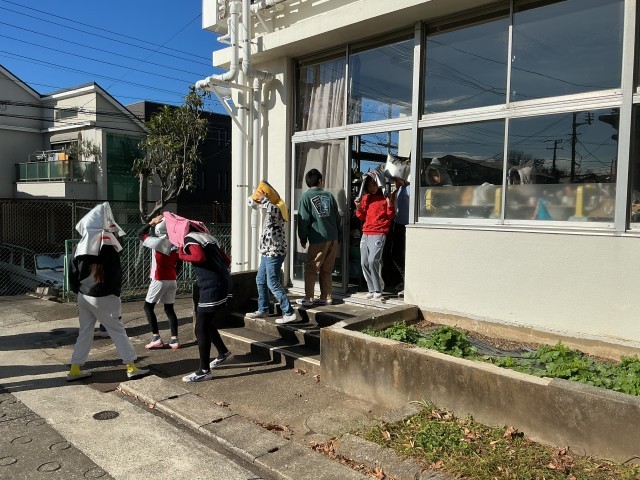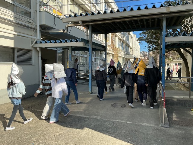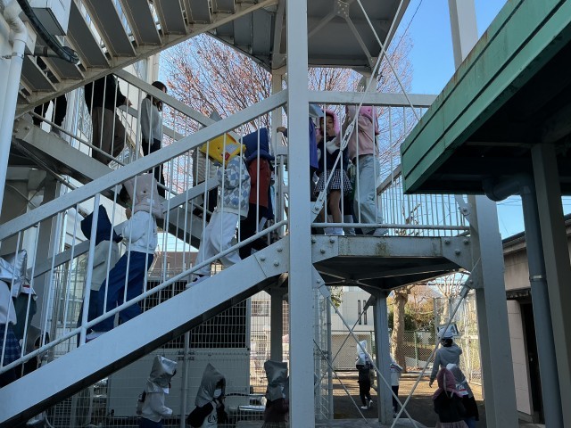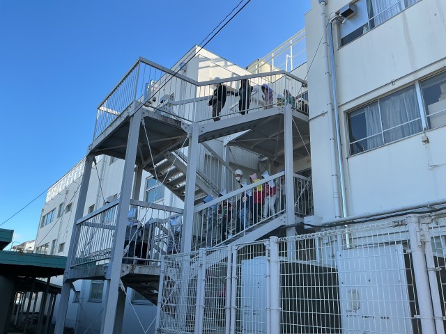 今日の避難訓練は地震後に理科室から火災が発生という想定のもと予告なしで行いました。理科室の場所柄、中央階段や渡り廊下は使用できません。北校舎の児童は非常階段を使って避難をしました。