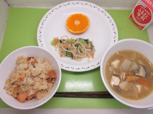 鮭ごはん・牛乳・芋煮汁・もやしのごまあえ・くだもの(はれひめ)