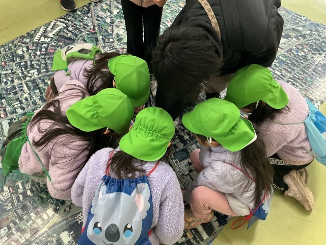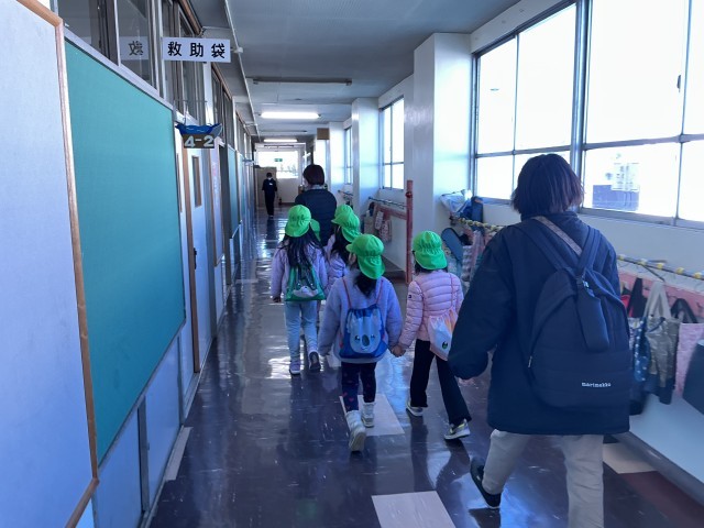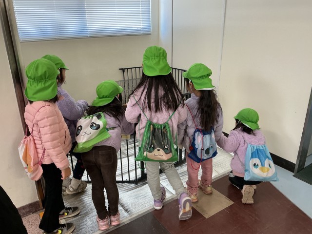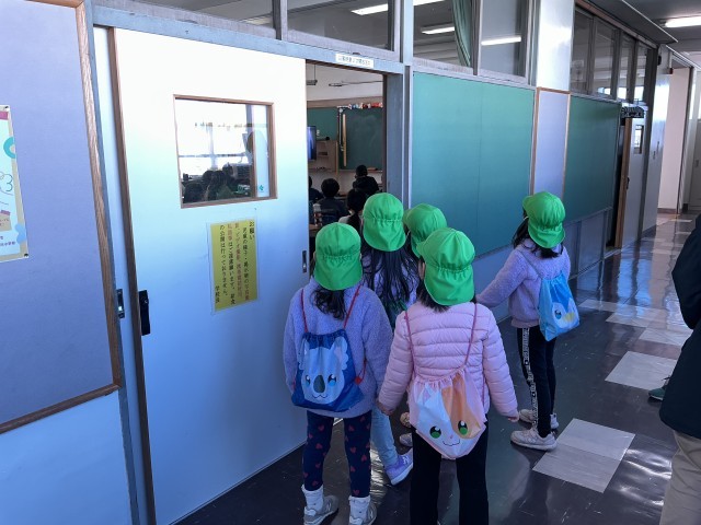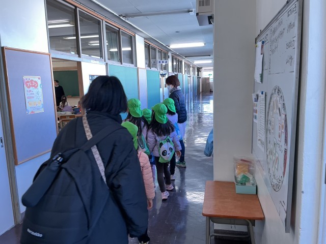 現在保育園に通う、来年度入学予定のお友だちが学校見学に来てくれました。階段の蹴込み板(段差部分)の絵を見て、どうやって描いたの?この部屋(家庭科室)は何するところ?航空写真の貼ってある渡り廊下では、通っている保育園と自分のお家を探しました。一番人気はやはりうさぎのマイケル♡マイケルもみんなの入学を待っています!
