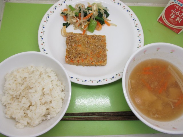 麦ごはん・牛乳・松風焼き・野菜のみそドレサラダ・さわにわん